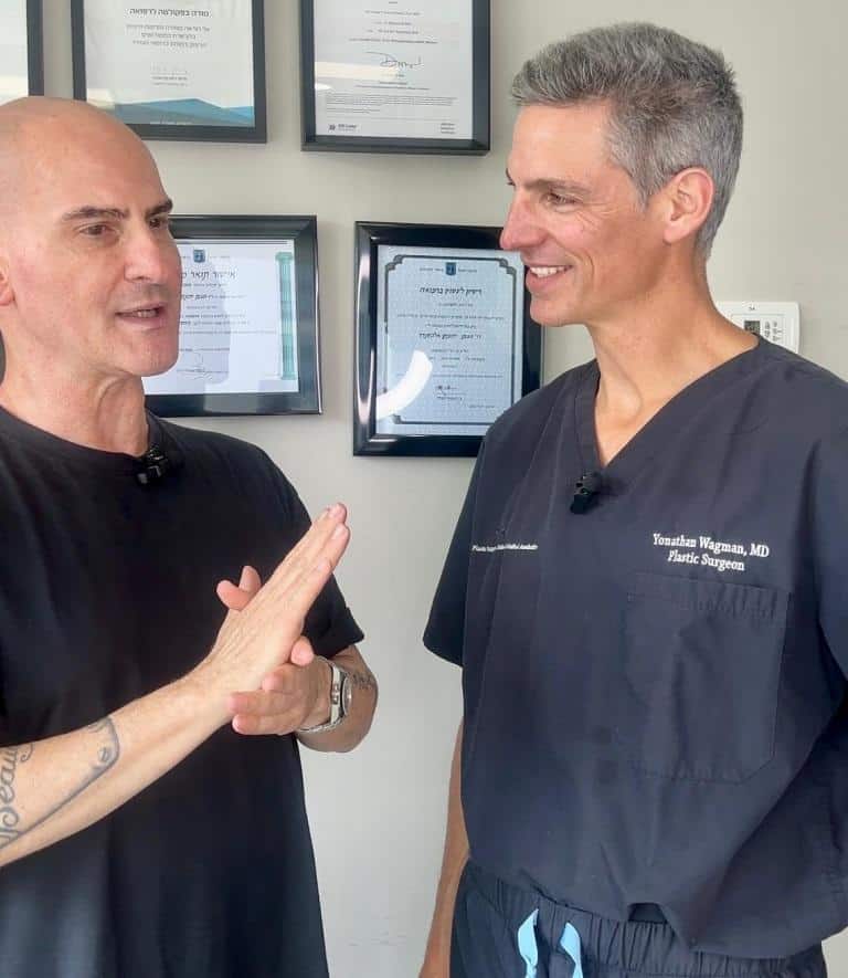 שחף: החלטתי לעבור את הניתוח אצל ד"ר יונתן ווגמן, שאותו אני מכיר שנים רבות , עוד בזמן ששימש כדוגמן של קסטרו לצד גל גדות, תוך שהוא לומד רפואה. בתקופה זו איפרתי רבים על סט הצילומים וכבר אז אמרתי ליונתן, חצי בצחוק, שיבוא יום ועוד אזדקק לו."