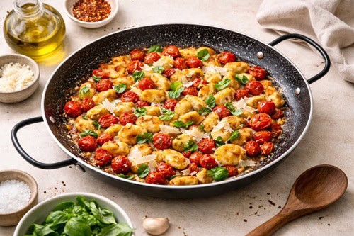 ניוקי מחבת זהוב עם עגבניות שרי מתפוצצות ושבבי פרמזן