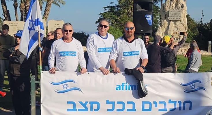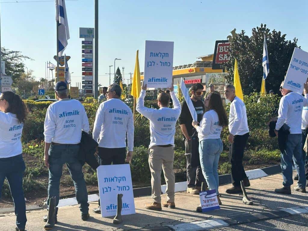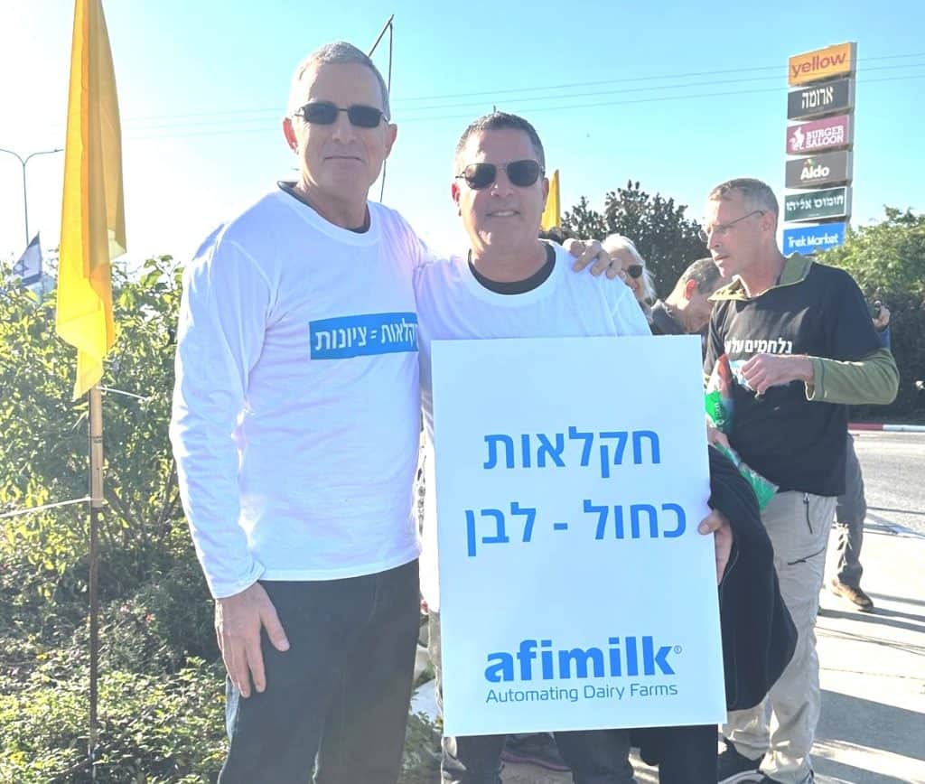 משמאל מנכ"ל "אפימילק" יובל רחמילביץ ועובדי החברה בהפגנת הרפתנים בצומת צמח – צילום: אפימילק