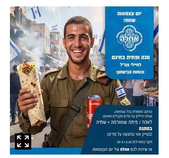 רשת "מסעדות "אחלה" מארחת את חיילי צה"ל ואנשי כוחות הביטחון במדים בימים שני ושלישי שלפני ערב יום העצמאות 20/21.04.26 בין השעות 12:00 ל- 19:00